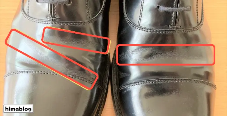 それぞれの違いを比較してみましょう。まずは、黒のストレートチップの靴の履きジワから。