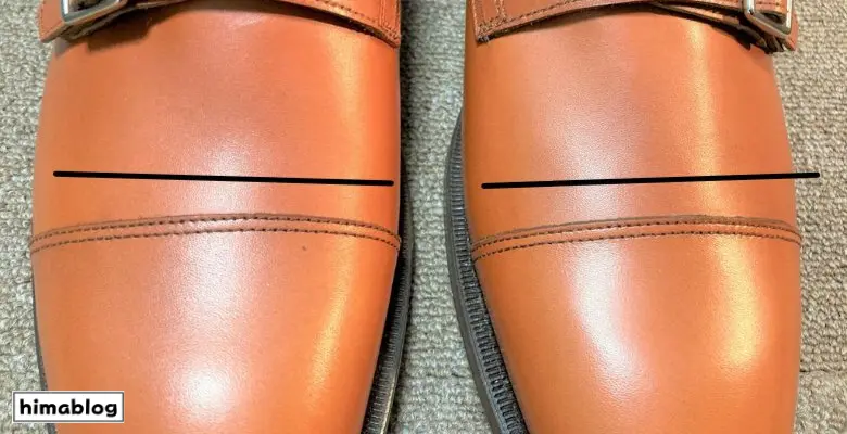 大きなシワも1つだけで水平に入っており、比較的に綺麗なシワですが、2つ靴を並べてみると左右のシワの入り方が非対称でバランスが悪いと感じます。